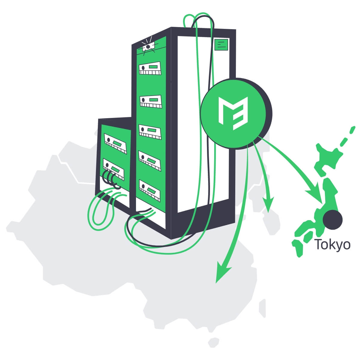 Illustration of server racks with green cables, map of Japan, and arrows pointing to Tokyo. Green Melbicom logo with "M" symbol.